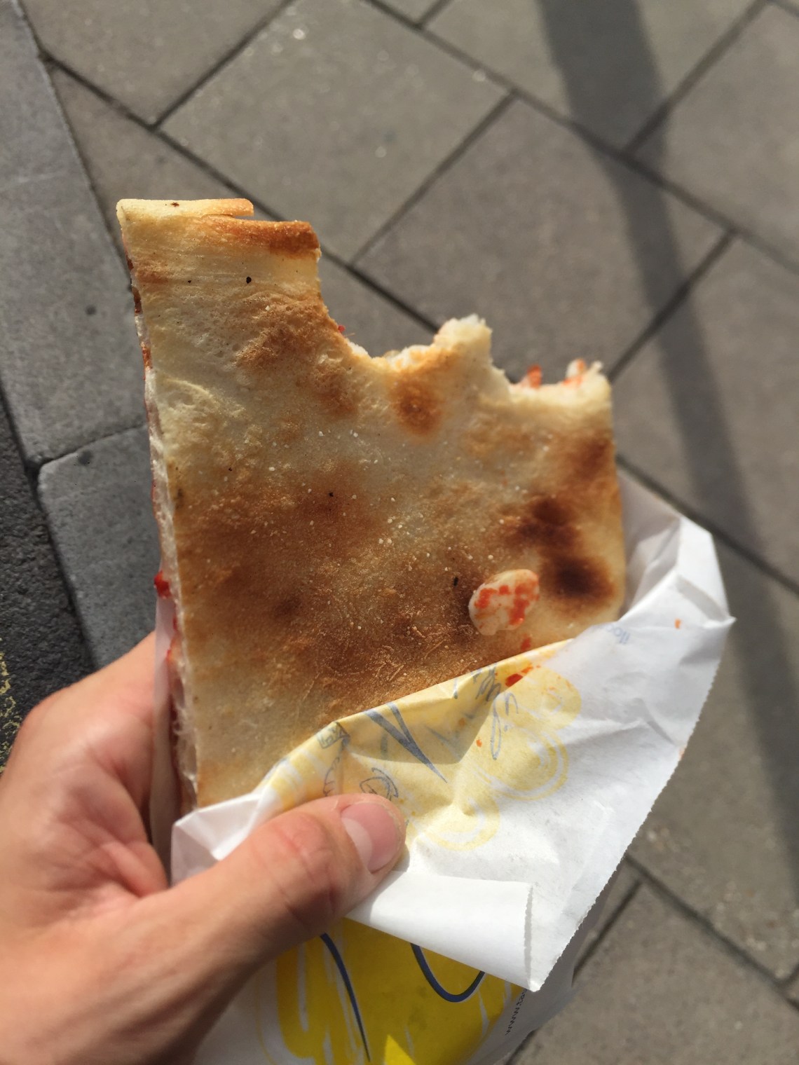 Despite the incredible looking selection, I, as is protocol, went for the Margherita. The guy scooped it up and warmed it up in a small oven at the back, which would usually indicate that this would be a bit of a sweaty mess, but surprisingly this is the exact opposite of the truth.